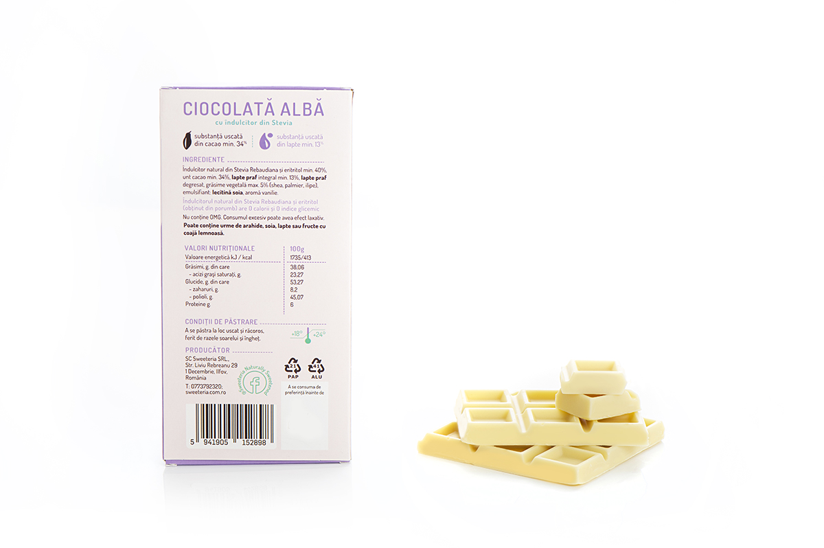 Ia aminte și notează numele produsului, ca sp îl ai mereu la îndemână când vrei să cumperi un cadou de mare efect, pentru o domnișoară în special, fie că este mai mare sau mai mică! Ciocolata albă fina promite delicii catifelate sunt tot atâtea argumente senzoriale care recomandă ciocolata noastră…dar avem și un serios argument rațional, și anume vestea bună că am scos tot zahărul din ciocolată și am îndulcit-o cu produsul nostru 100% natural, Dulcișor, un îndulcitor pe bază de stevia rebaudiana și eritritol din porumb nemodificat genetic, care nu conține deloc calorii și nu are impact glicemic! Cu alte cuvinte, am redus la minimum aportul caloric al ciocolatei noastre.
