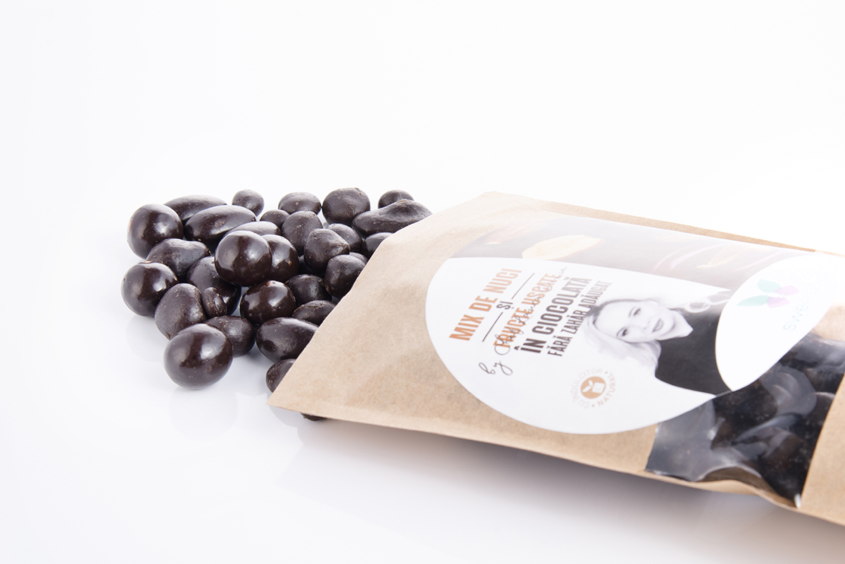 Vă propunem deci un amestec de alune de pădure, migdale și stafide fiecare învelite în mantaua proprie de ciocolată amăruie fără pic de zahăr, îndulcită numai cu Dulcișor by Sweeteria, respectiv cu stevia rebaudiana și eritritol din porumb nemodificat genetic! Deci 100% natural și 100% românesc, dedicat celor care vor să reducă aportul caloric fără să renunțe nici la plăcere și nici la alimente nutritive și carbohidratice. Ideal pentru vegani și cei care țin post!