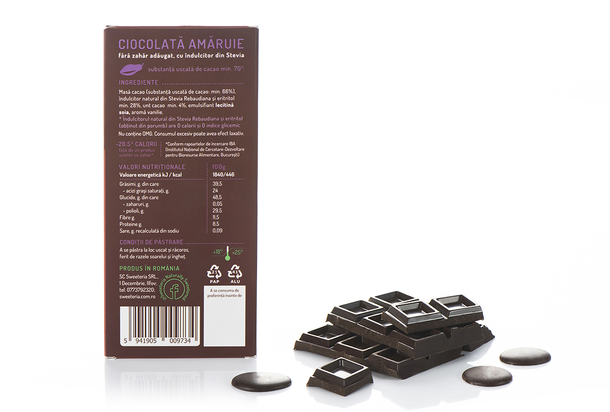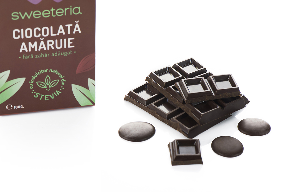 Statistic, este ciocolata preferată a celor care se gândesc și la plăcere și la siluetă, a moderaților și pasionaților care iubesc gustul ciocolatei și nu se pot opri la un singur pătrățel. Nici nu au vreun motiv să fie atât de stricți, deoarece ciocolata amăruie de la Sweeteria nu conține niciun strop de zahăr și nicio calorie provenită de la îndulcitor – gustul ei dulce discret se datorează îndulcitorului creat de Sweeteria din stevia rebaudiana și eritritol din porum nemodificat genetic, îndulcitor cu zero calorii propriii și niciun impact glicemic. De aceea ciocolata amăruie Sweeteria este recomandată inclusiv în dietele diabeticilor. Este un desert de post, vegan, foarte bun prieten cu stările de spirit, deoarece conține suficient de multă cacao pentru a conta ca furmizor de magneziu și substanțe stimulante de calitate bună. Te ajută să te concentrezi și îți dă bună dispoziție atunci când ai cea mai mare nevoie de ea!